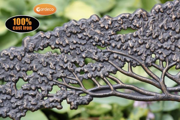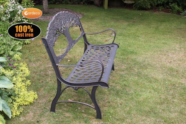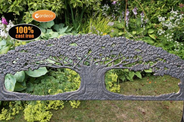 This bench is made from 100% cast iron. Includes a high definition ductile cast iron motif on the back of the seat. This model has a motif of a majestic tree and comes in a black colour with a bronze patina.