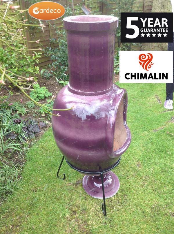 This extra-large chimenea with a large opening mouth, for full view of the fire and easy re-fuelling, can be located on any patio and comes with a metal stand and matching clay lid. The finish on this chimenea is a glaze with a mottled purple colour.