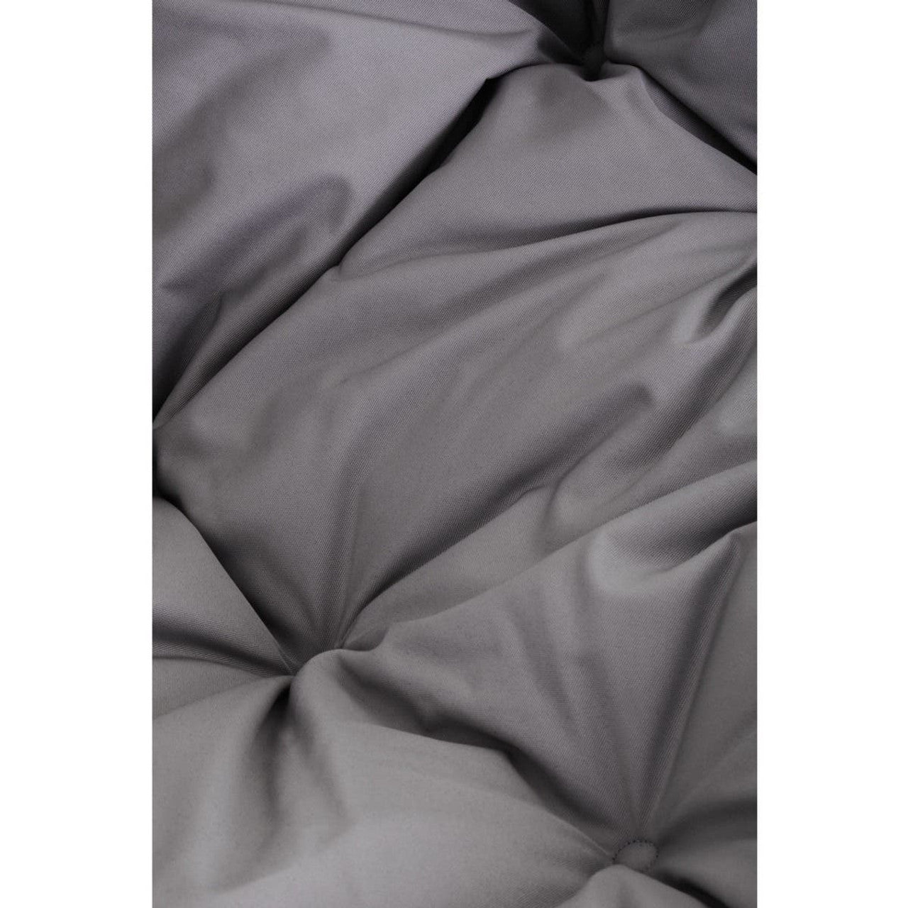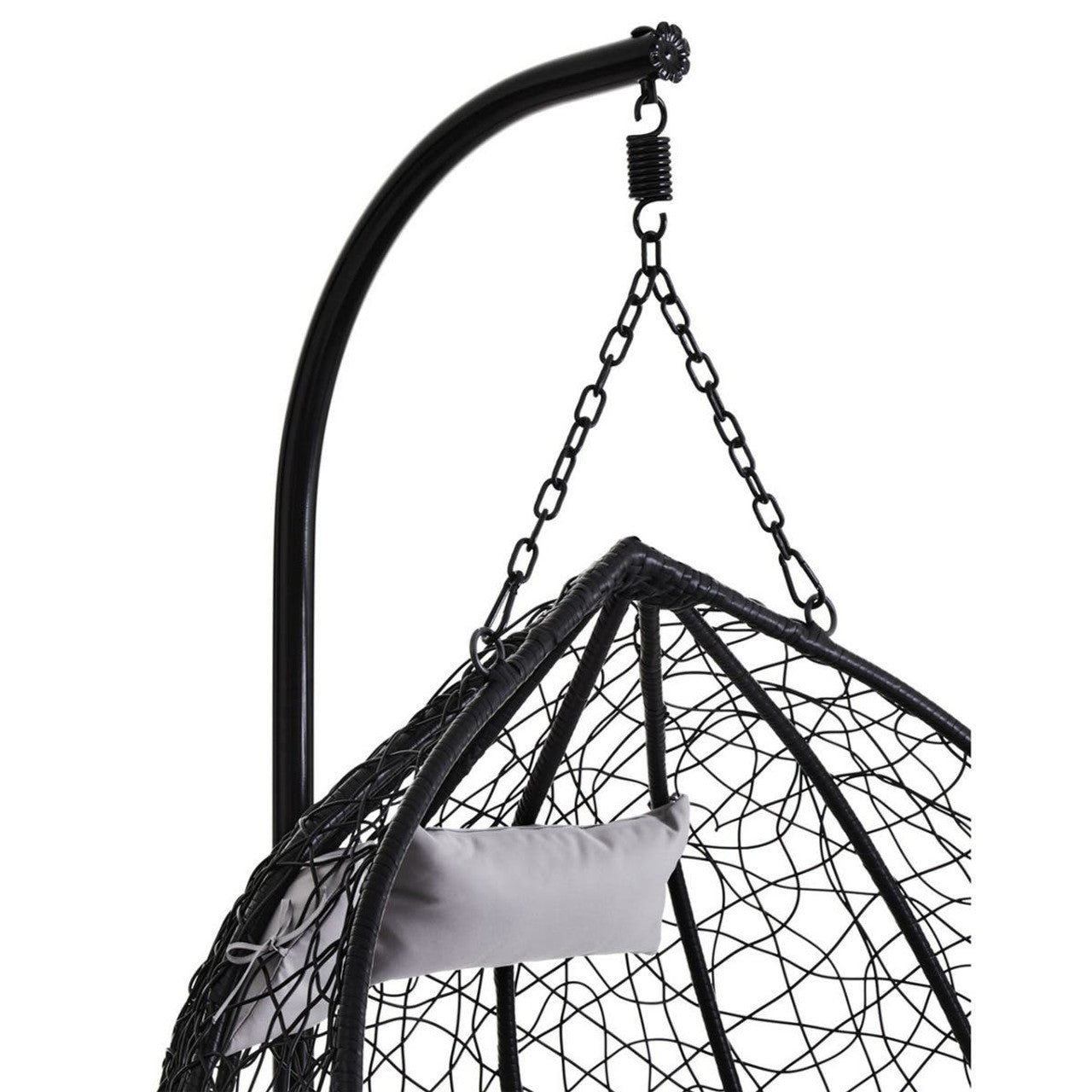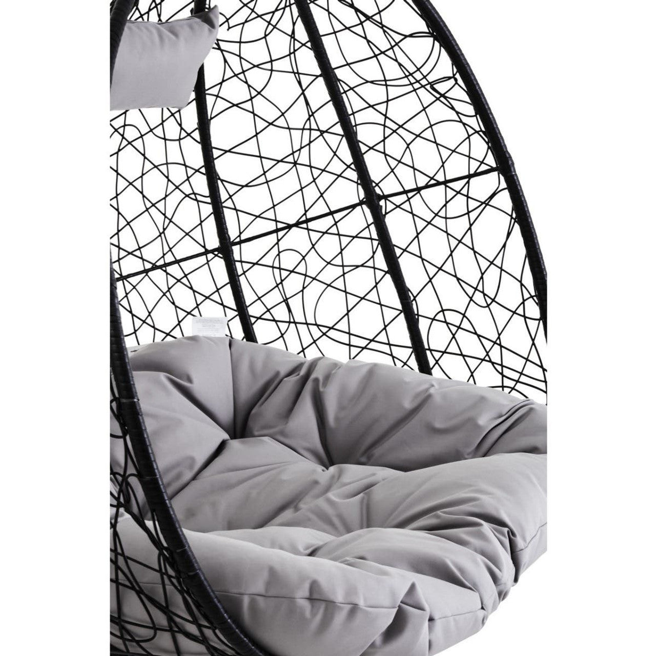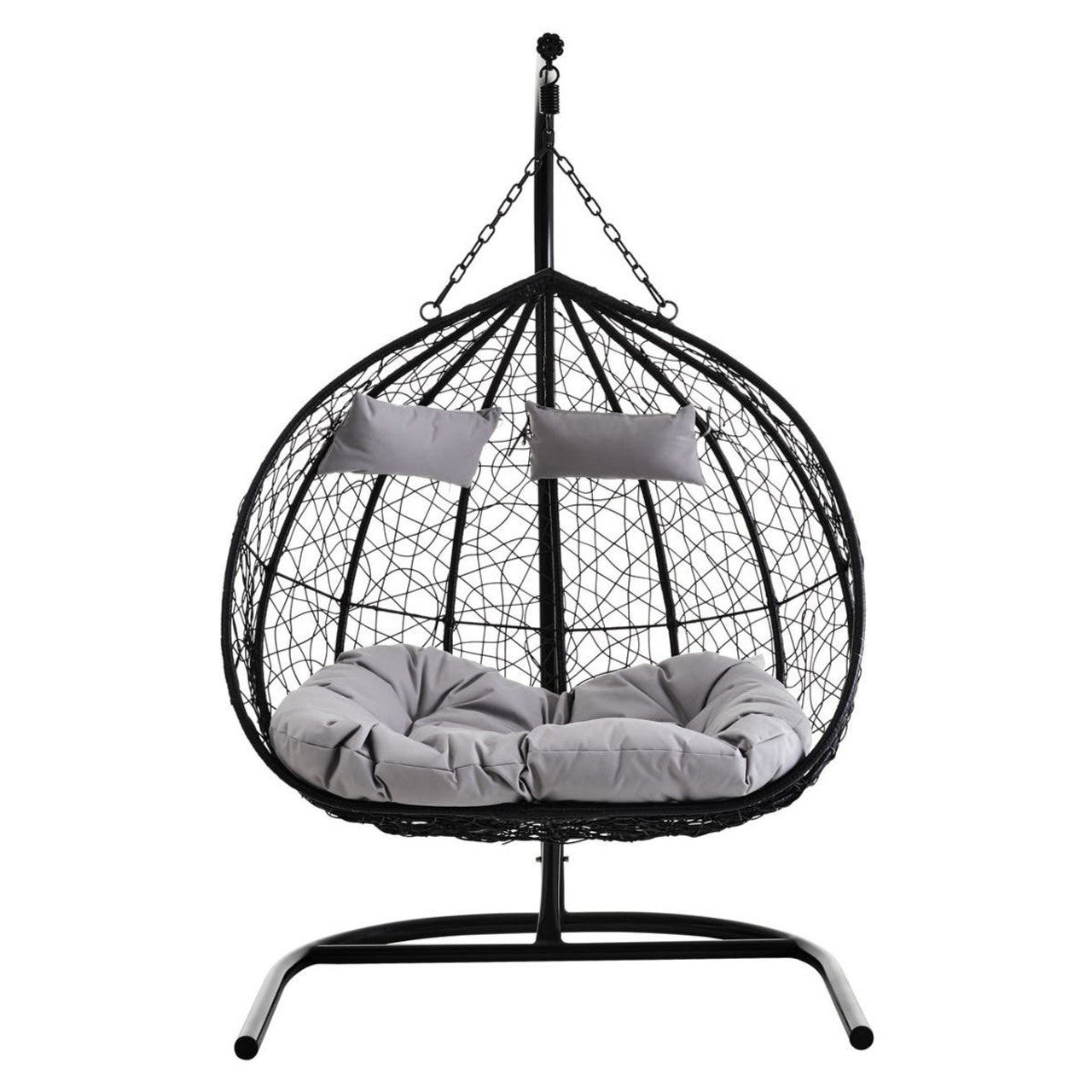 The contemporary black rattan effect double hanging chair features plush grey cushions and a sleek black metal frame with a sledge base.