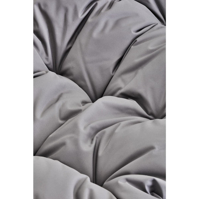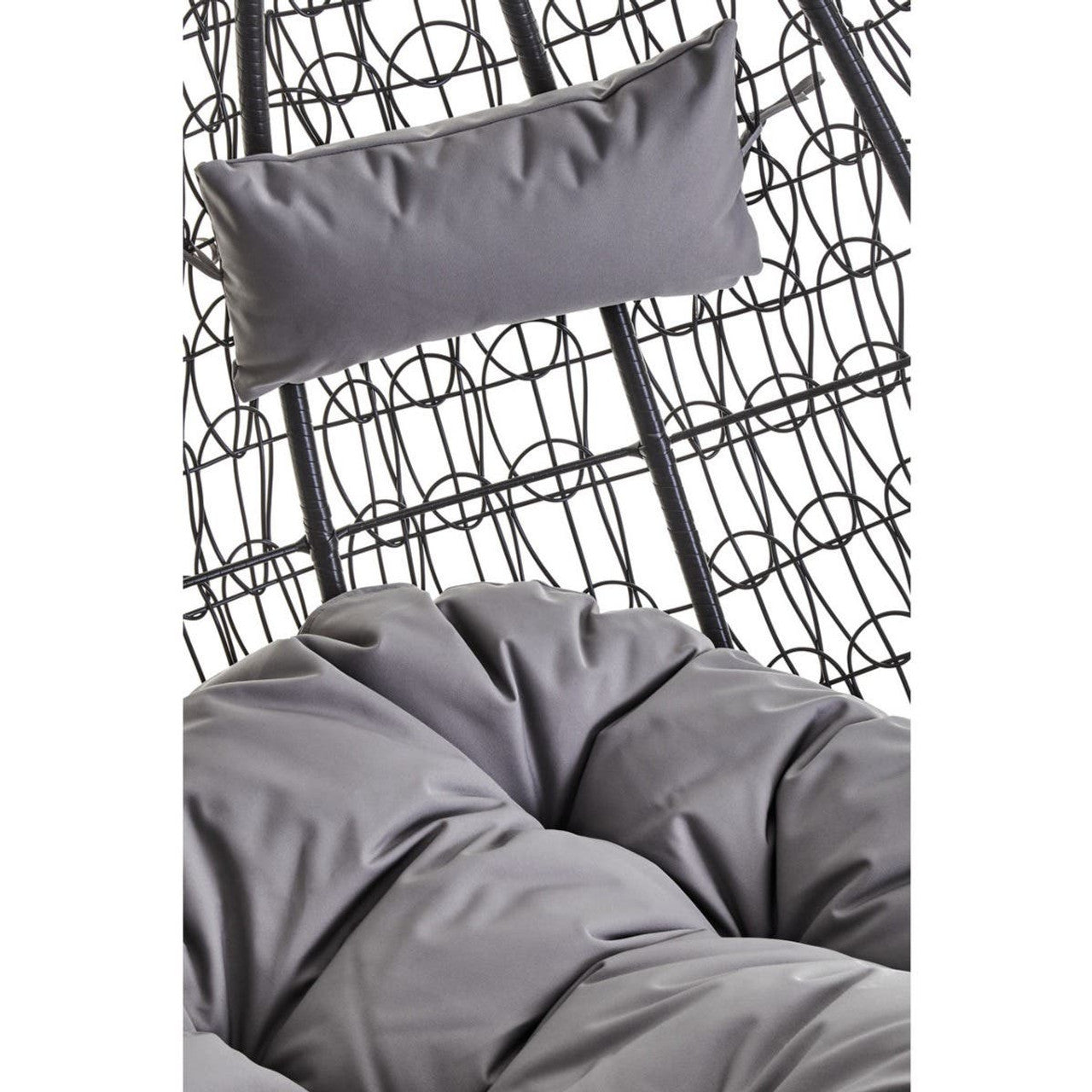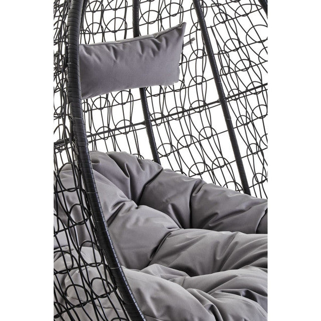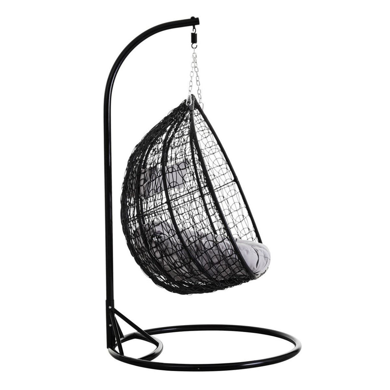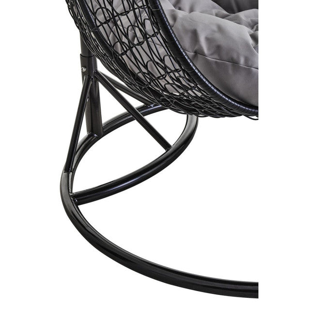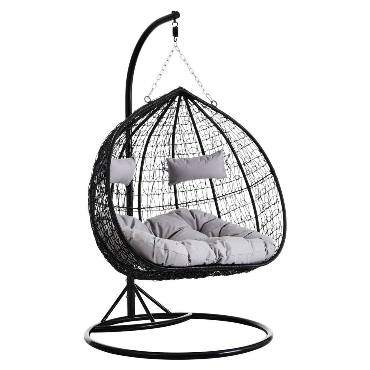 This black rattan effect double hanging chair features quilted grey cushions and a sleek black metal frame, with a round base.