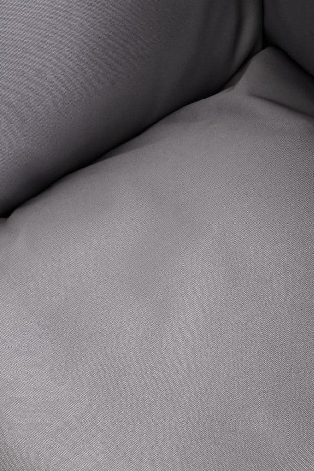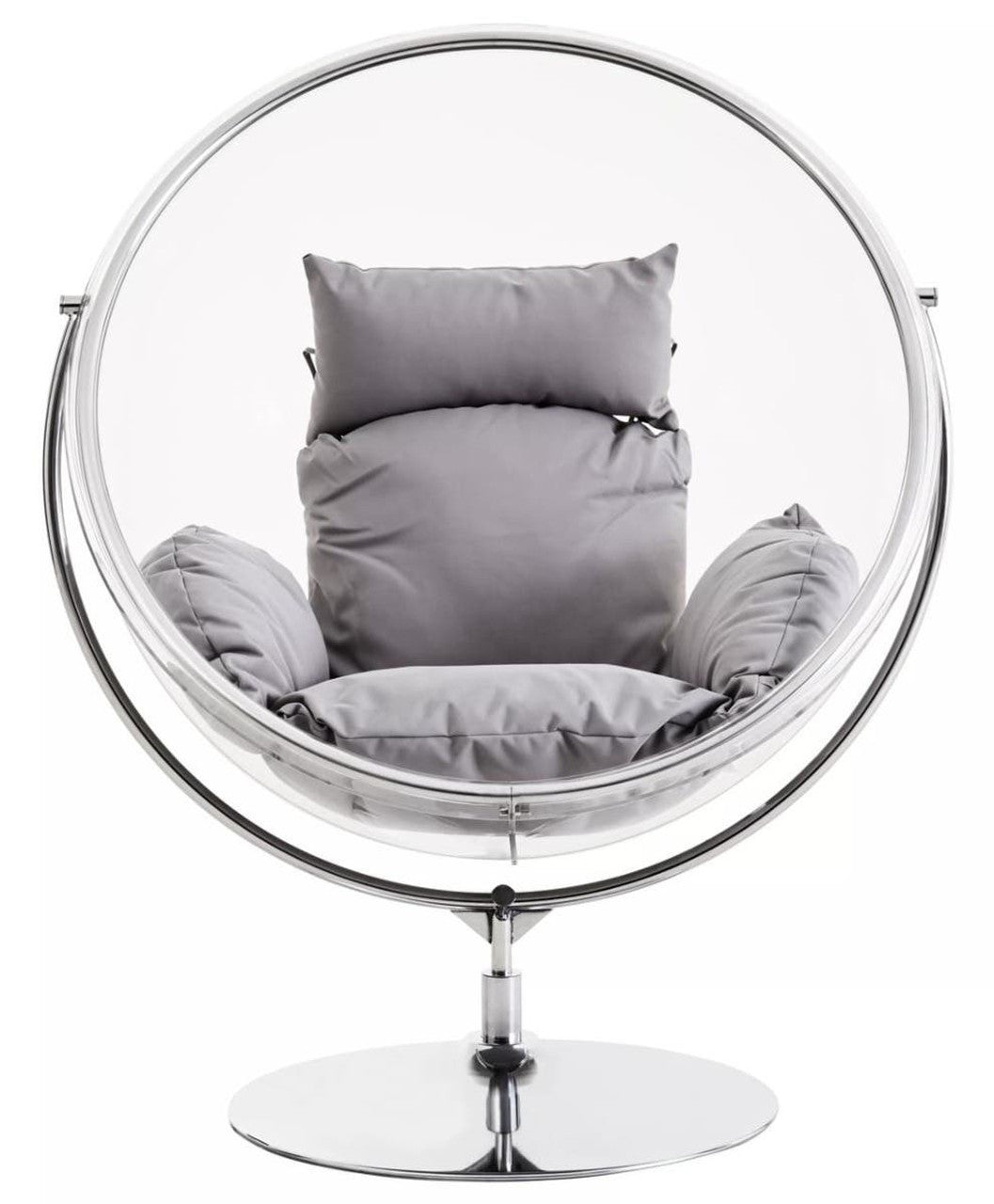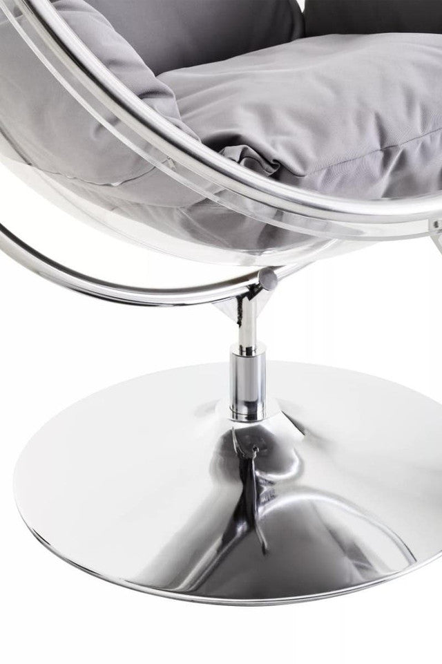 This swing chair is perfect for relaxation and comfort thanks to its clear swing seat, stainless steel frame, and grey cushions.