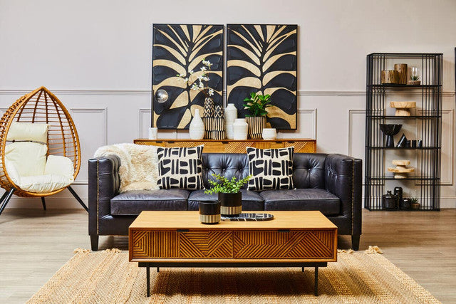 This stylish chair features a natural rattan effect weave providing warmth, while its cream cushions and black metal legs give it a modern look.