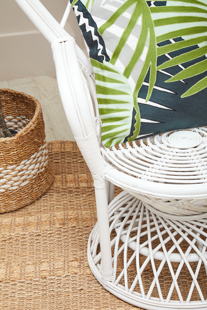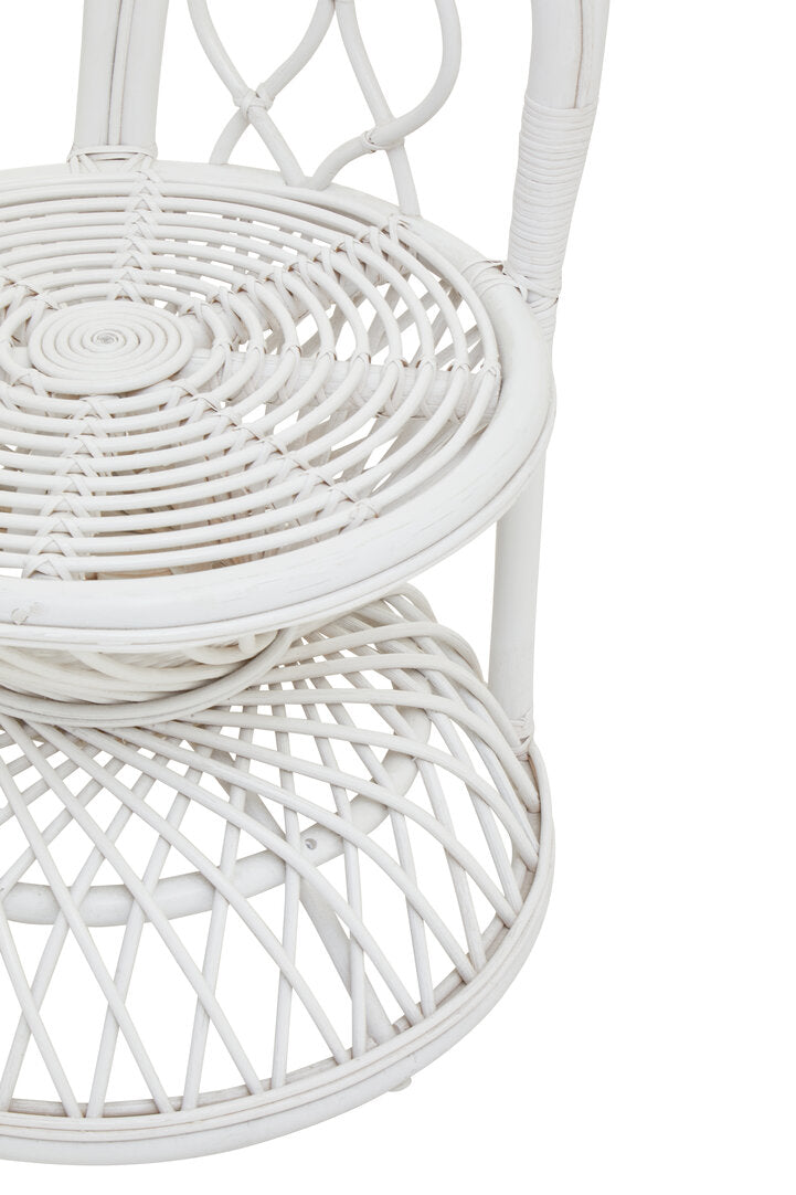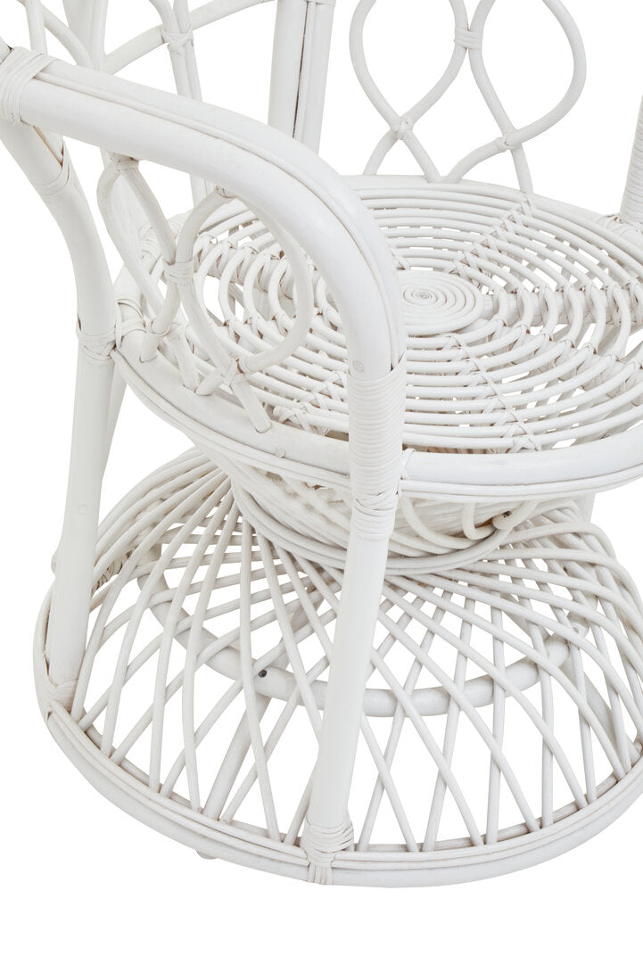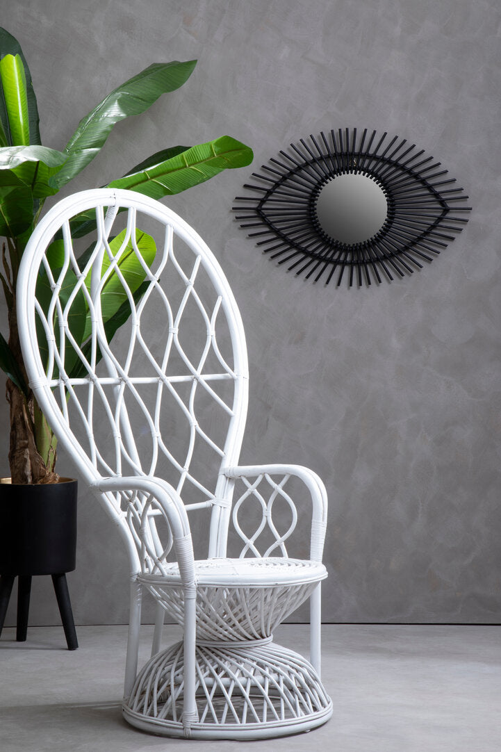 Intricately woven from renewable natural rattan, this chairs high back gently expands to create a peacock design complemented with curved arms. The flat, comfortable seat rests on an inverted bowl base to complete the decorative aesthetic.