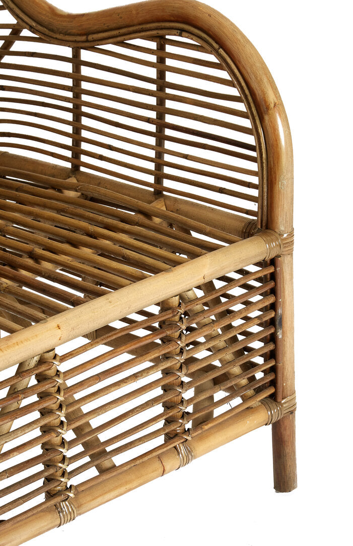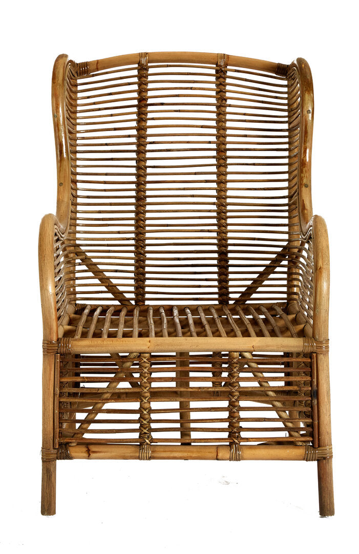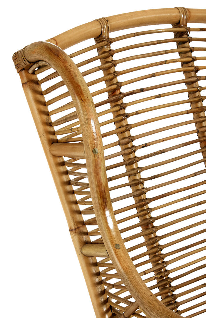 This chair is hand woven from natural rattan and features a subtly reclined back with curved armrests. The undulating profile will create a visual statement, while the slim bands of rattan are tightly wrapped to ensure stability.
