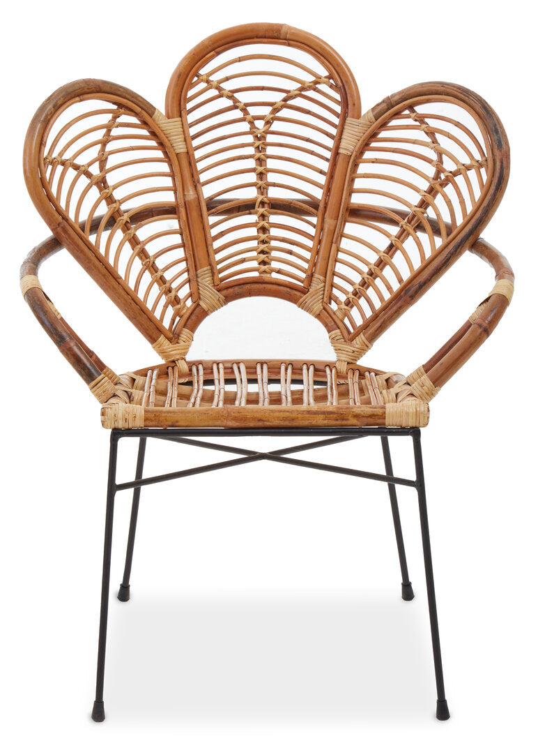 This chair features a combination of exotic and industrial styles. Skilfully hand woven from natural rattan, the backrest of this chair features three oversized petals supported by a wooden frame. The sleek black finish iron legs add style to it.