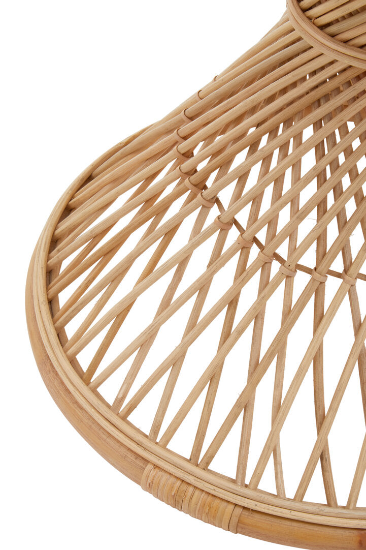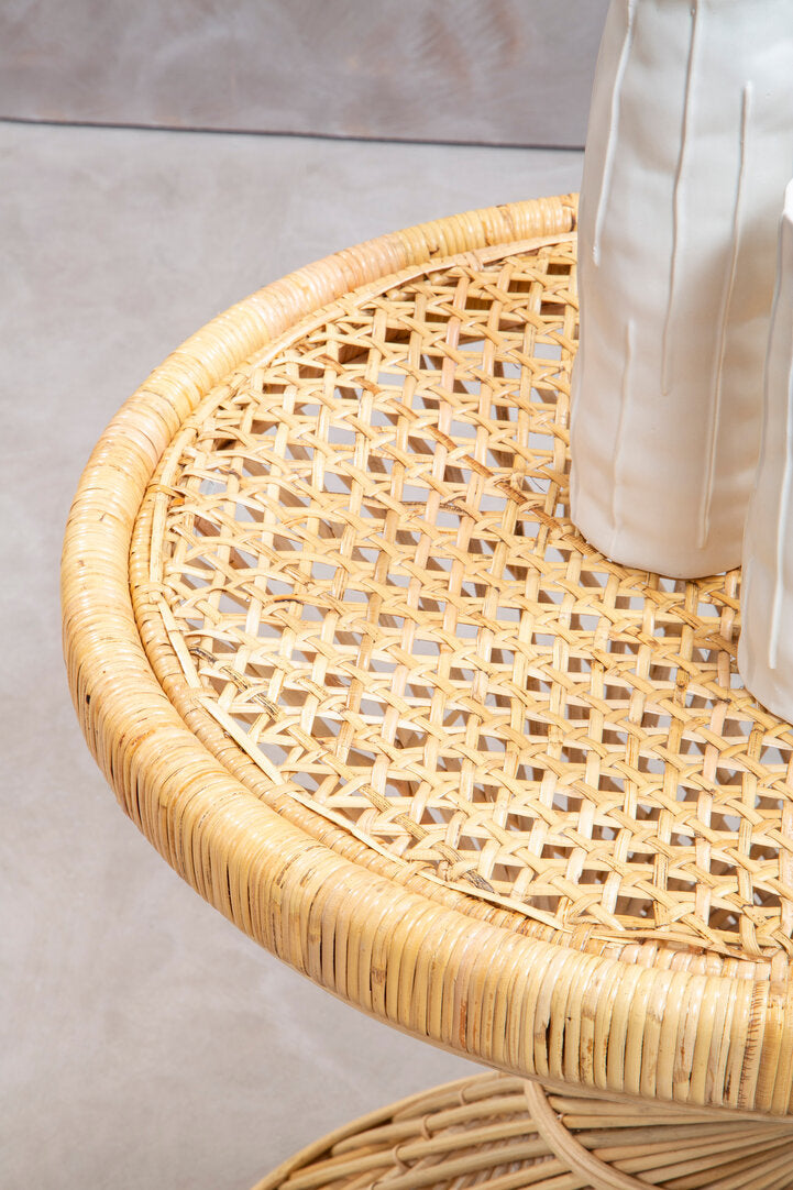 The Mataram rattan side table with lined design base displaying an hour glass shape. The table is made from sustainable rattan, the table features sleek lines which gently bend to create a twisted design. The quirky base in natural accent matches the top that is intricately woven to elevate style and texture.