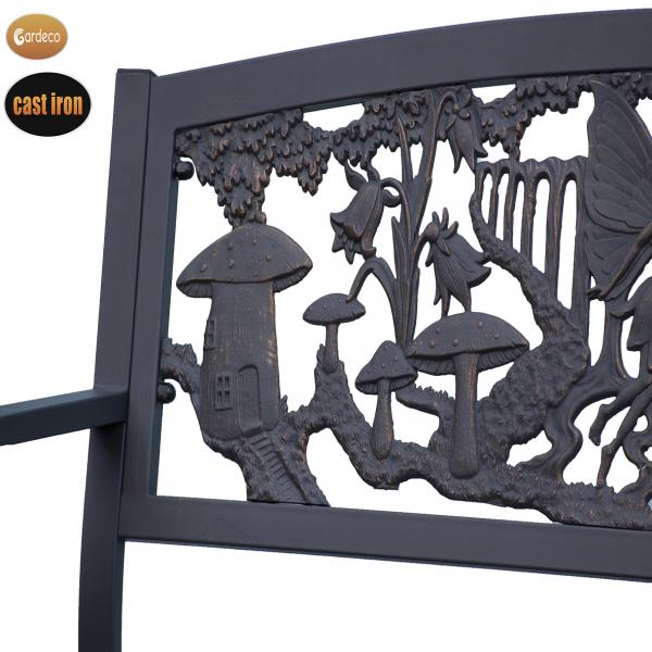 The bench is made from cast iron with a steel framing that includes a high definition ductile cast iron motif on the back of the seat. This model has a motif of fairies and comes in a black colour with a bronze patina.