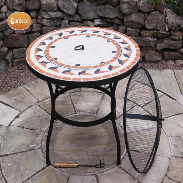 This unique fire pit doubles as a side table when not in use. The luminous tiles mosaic gives a perfect mediterranean ambiance.