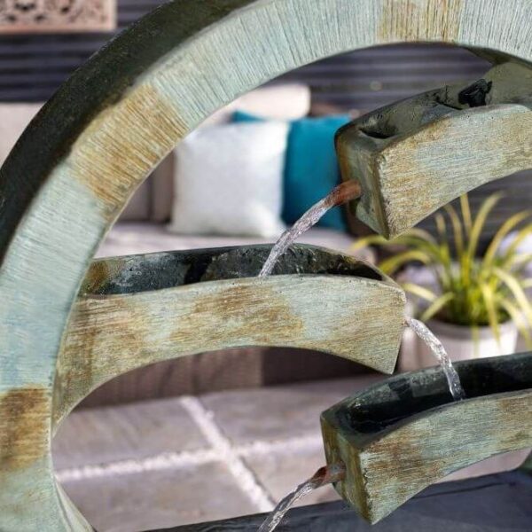 Sitting on a plinth, the cleverly designed contemporary fountain consists of a circular device with internal arms through which water flows. Upon collection at the fountain’s base, the water within this self-contained feature begins its journey again.