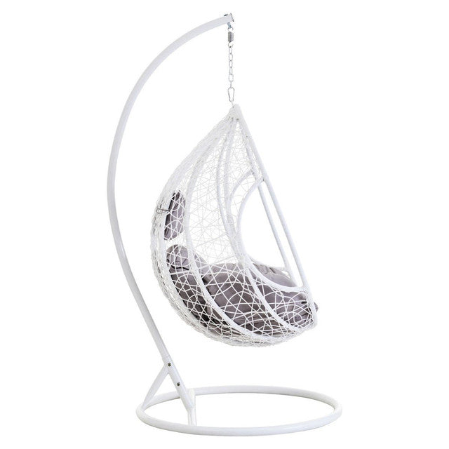 This hanging chair has an egg shaped design that is crafted from white rattan effect weave and open armrests on both sides. Grey cushions with foam filling add comfort, while the sleek white metal provides stability and a modern look. This garden chair is perfect for indoor and outdoor use.